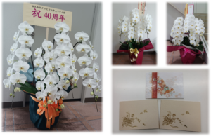 先日につづき、40周年のお祝いを多数いただきました。 お忙しい中、当社のためにお気遣いをいただきましたこと、社員一同、心より感謝申し上げます。